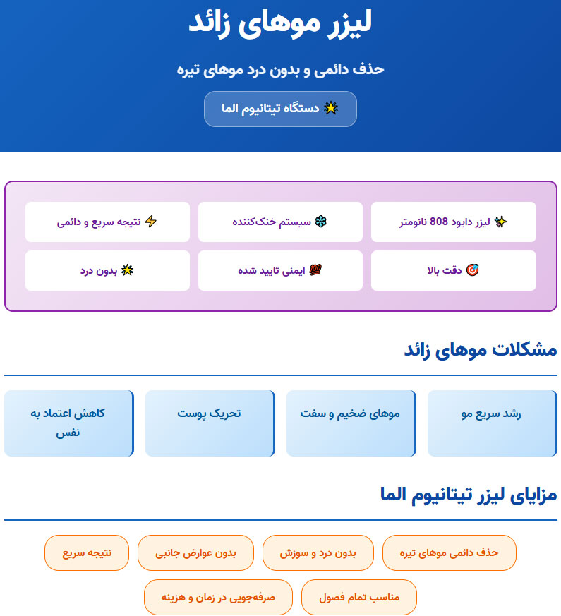 الکساندرایت ۷۵۵ nm | روشن (I و II) | کم | اثر زیاد بر موهای روشن، خطر لک در پوست تیره |