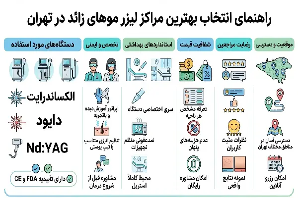 مراکز لیزر مو در تهران تنوع بسیار زیادی دارند، اما همه آن ها کیفیت یکسانی ارائه نمی دهند. معیار انتخاب نباید فقط نزدیکی محل یا قیمت باشد. استاندارد بودن محیط، نوع دستگاه، حضور پزشک، تجربه اپراتور و شفافیت تعرفه ها از اصلی ترین شاخص ها هستند. مراکزی که قبل از شروع کار، مشاوره واقعی انجام می دهند و تست شات می گیرند، معمولاً حرفه ای تر عمل می کنند. همچنین بررسی سابقه مرکز و رضایت مراجعان قبلی، دید واقع بینانه تری می دهد. در تهران، مراکز معتبر معمولاً در محدوده هایی مثل دولت، شریعتی و شمال شهر تمرکز بیشتری دارند، اما کیفیت صرفاً به منطقه وابسته نیست.
